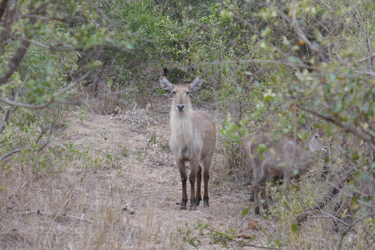 Zwei Wasserböcke blinzeln aus dem Busch.