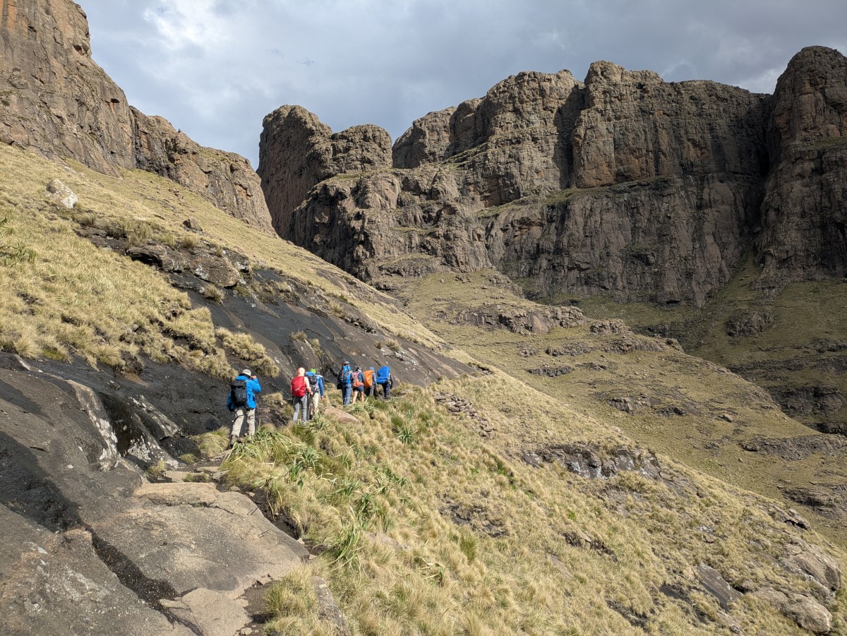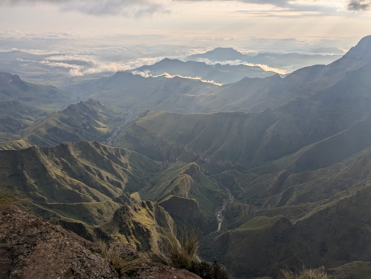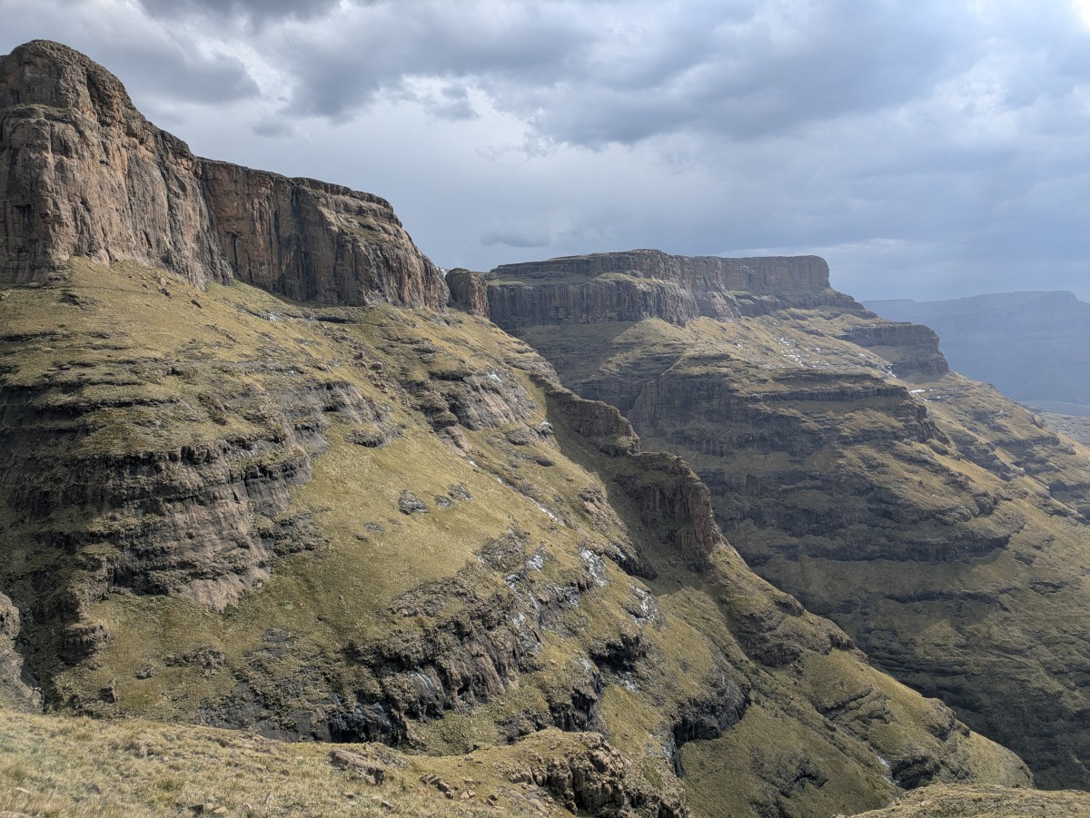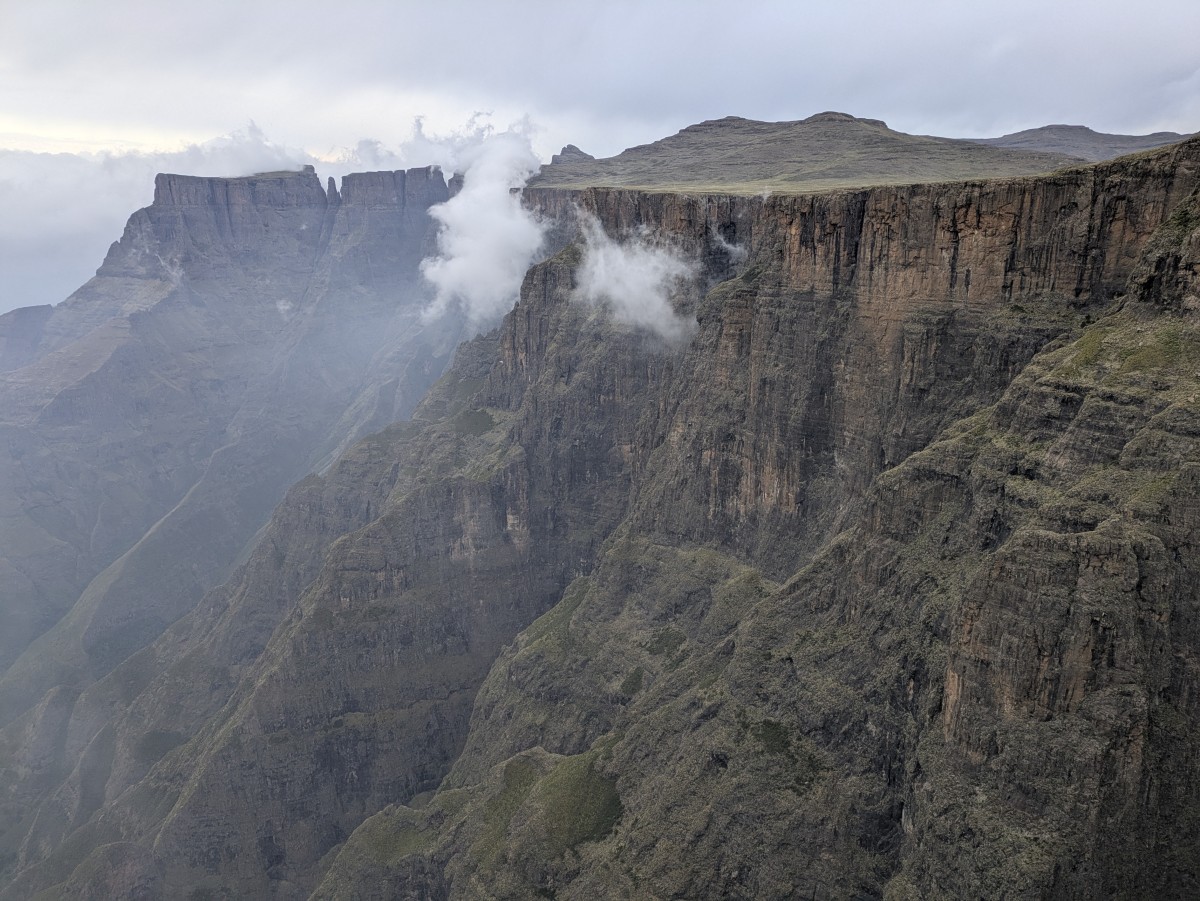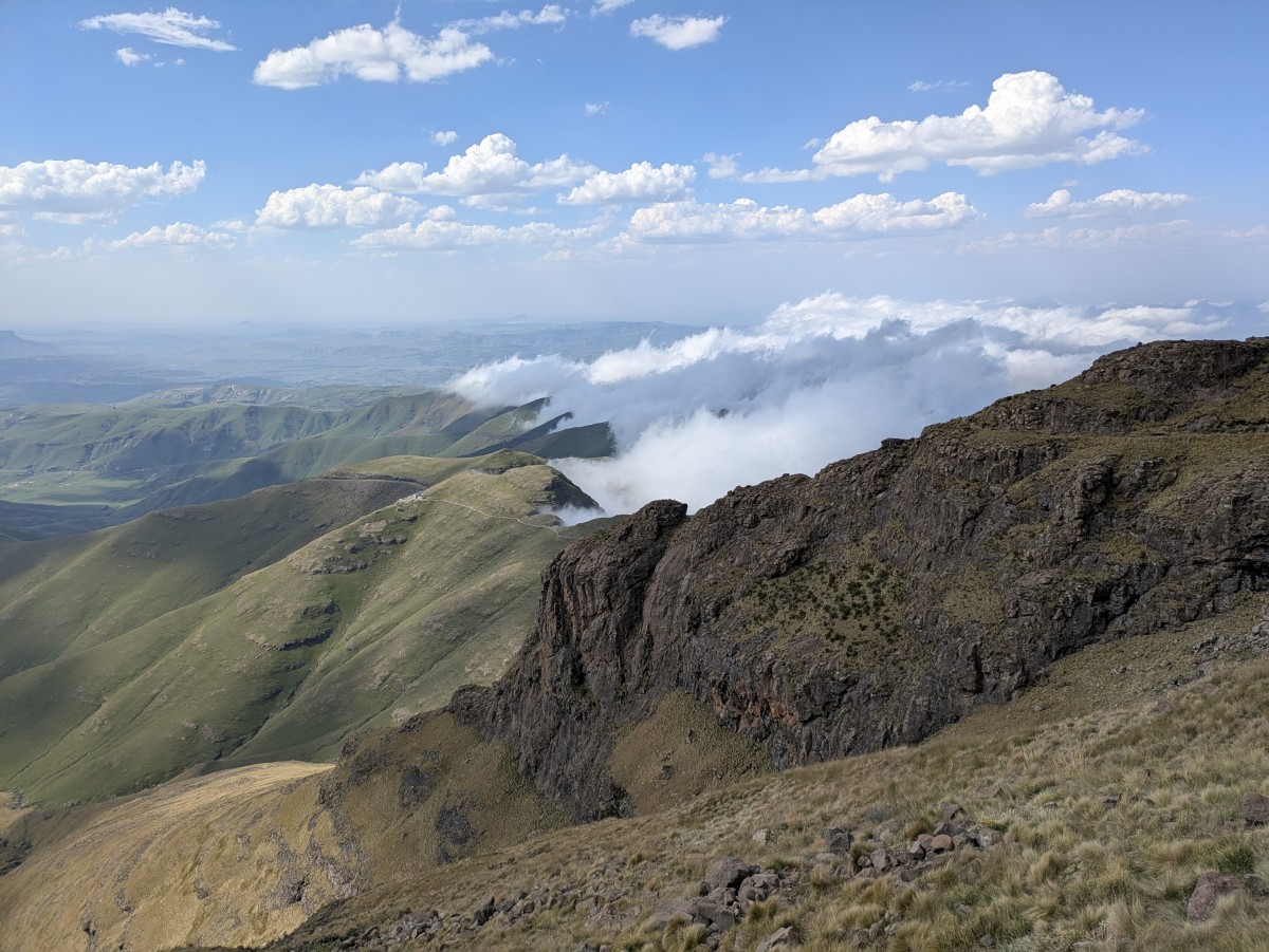 Endlich sind wir auf dem Hochplateau der Drakensberge angekommen, also auf um die 3000 Meter über Meer. Auf dieser Höhe wird uns die Tour über die nächsten vier Tage weiterführen. Die Blicke hinab in die Steilabbrüche sind ungemein reizvoll.