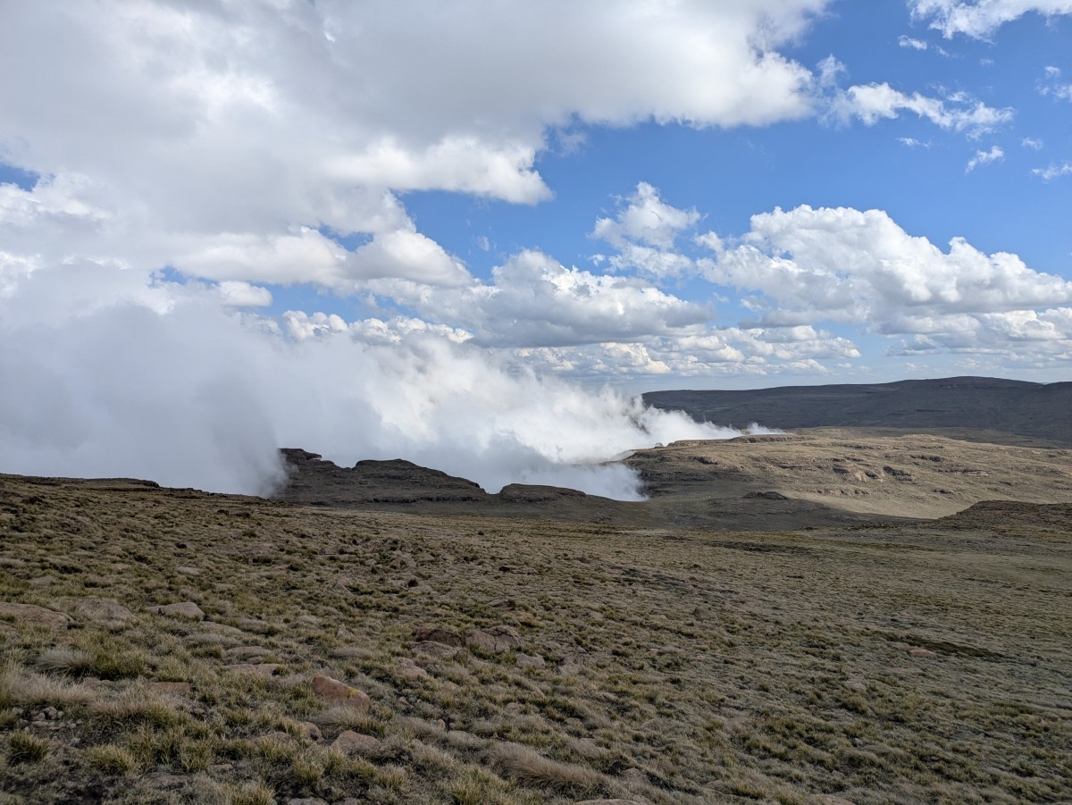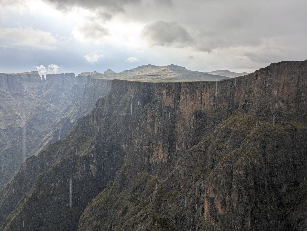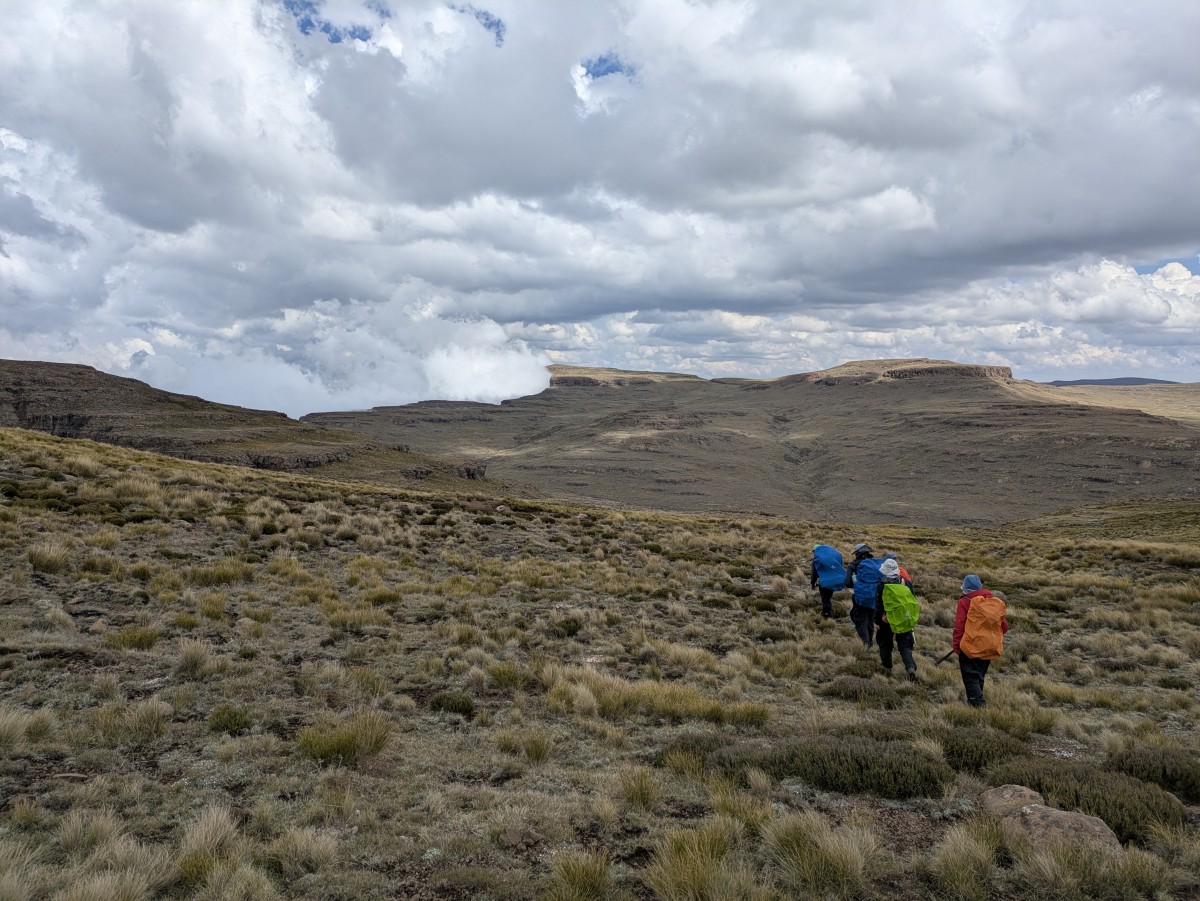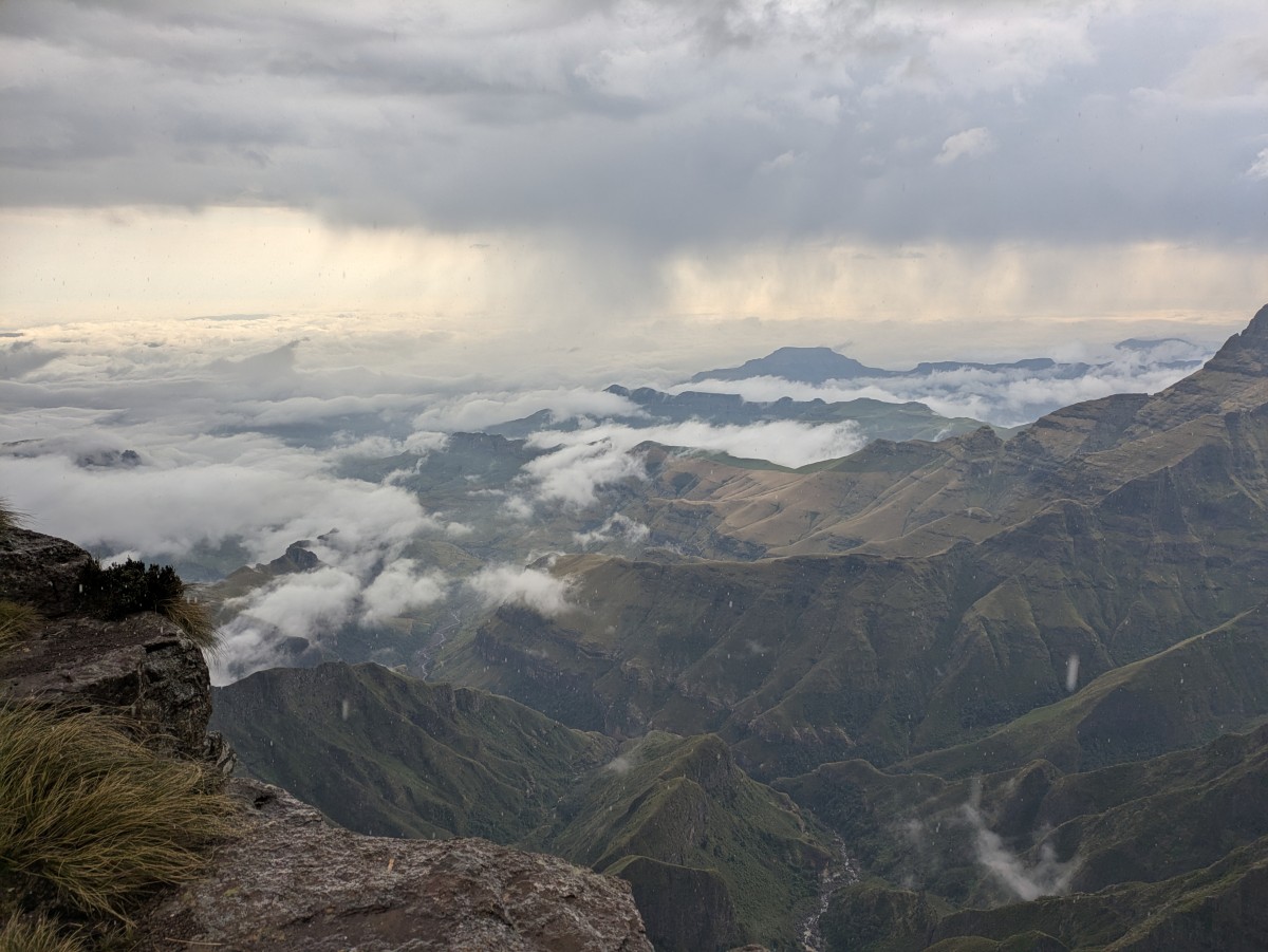 Endlich sind wir auf dem Hochplateau der Drakensberge angekommen, also auf um die 3000 Meter über Meer. Auf dieser Höhe wird uns die Tour über die nächsten vier Tage weiterführen. Die Blicke hinab in die Steilabbrüche sind ungemein reizvoll.