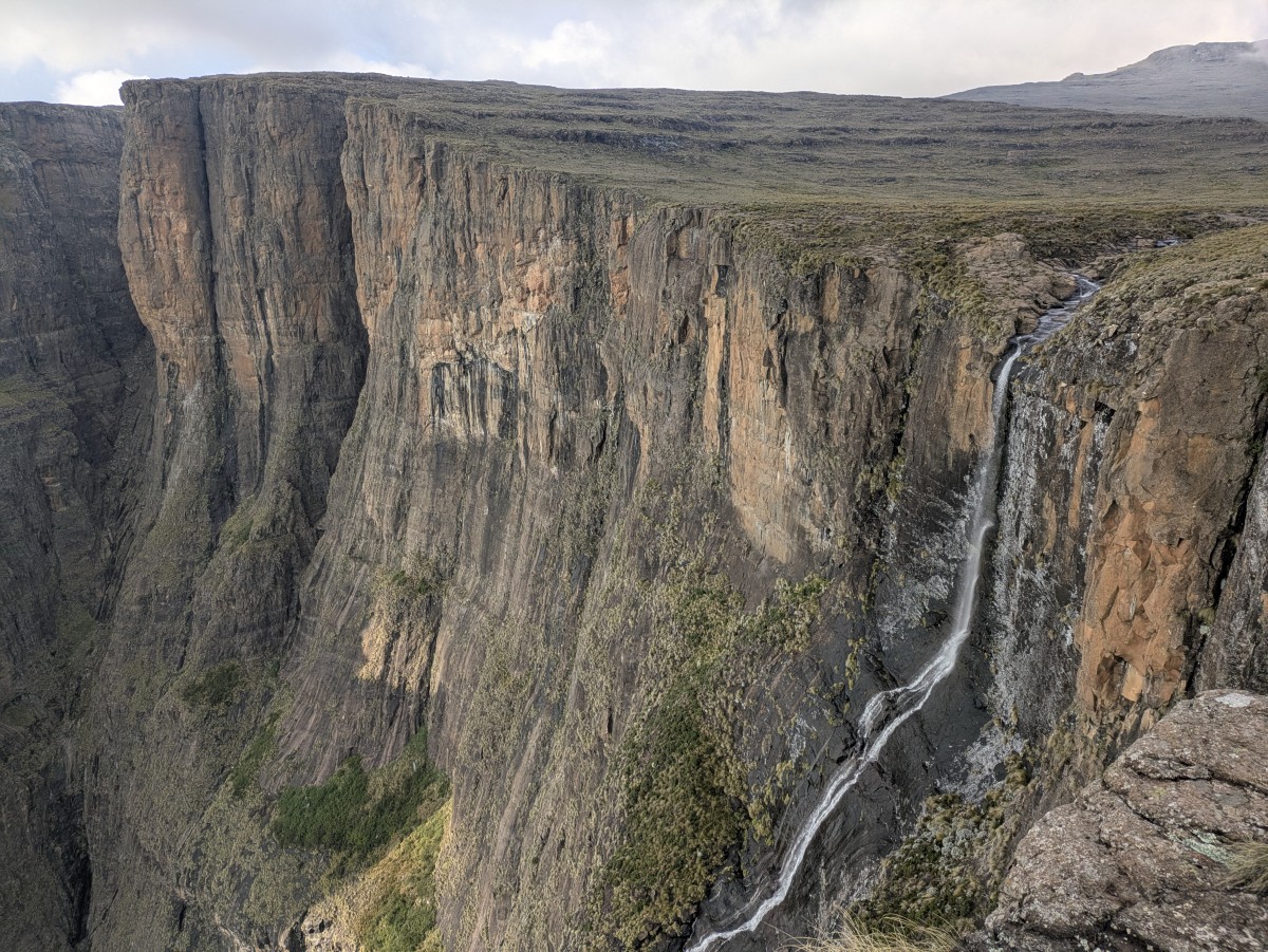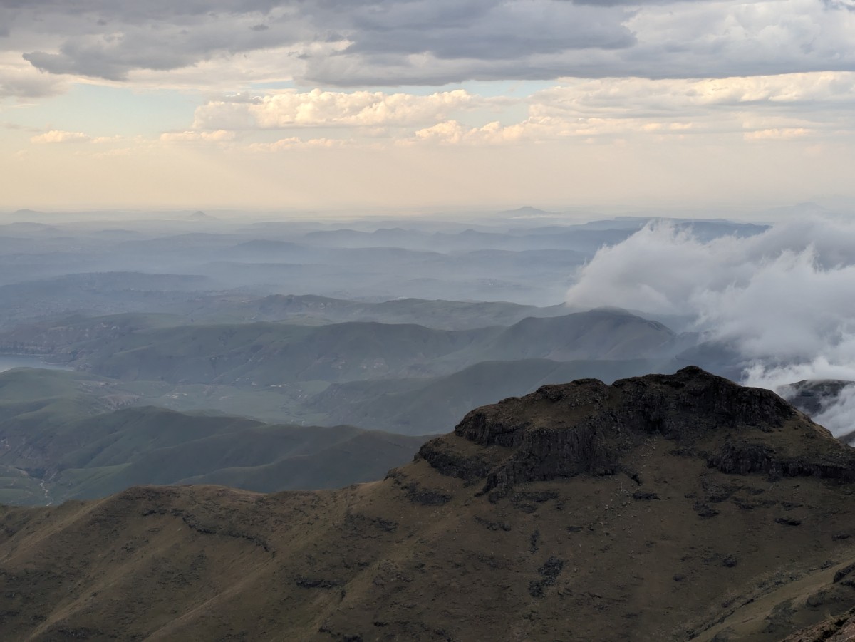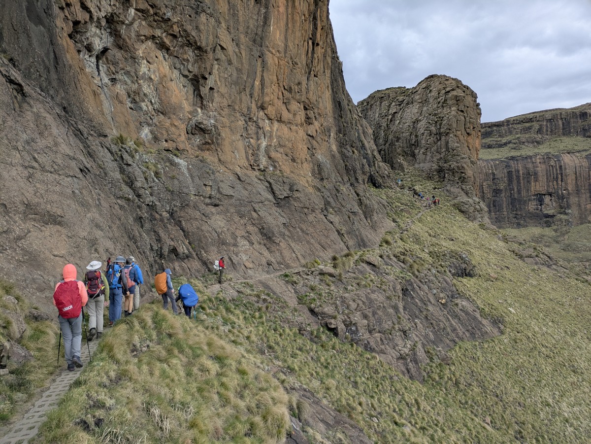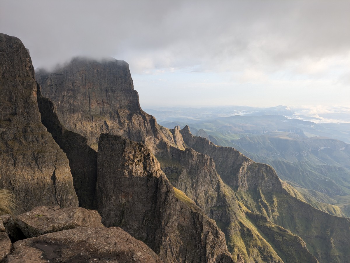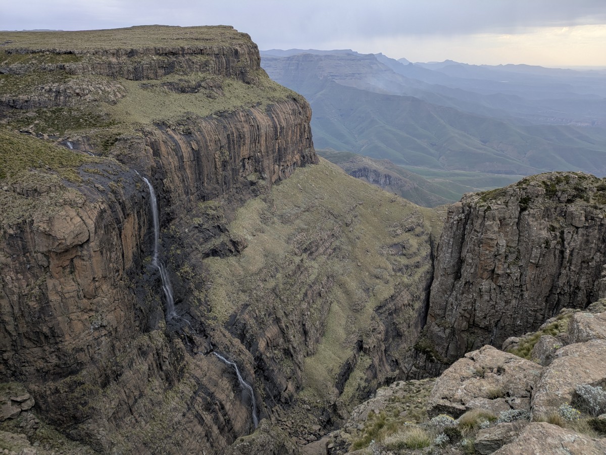 Endlich sind wir auf dem Hochplateau der Drakensberge angekommen, also auf um die 3000 Meter über Meer. Auf dieser Höhe wird uns die Tour über die nächsten vier Tage weiterführen. Die Blicke hinab in die Steilabbrüche sind ungemein reizvoll.