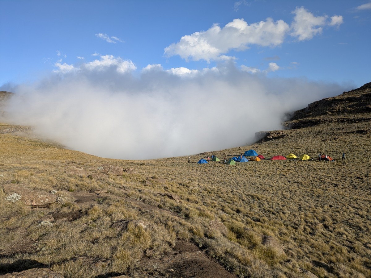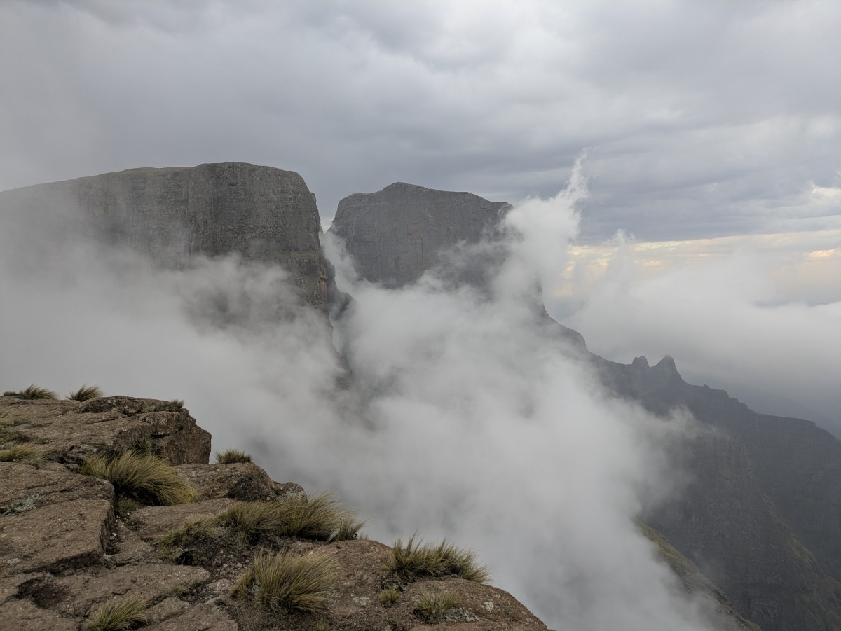 Am Nachmittag langen wir am Lagerplatz bei den Tugela-Wasserfällen an. Am Sentinel schwappen die Wolken nach oben.