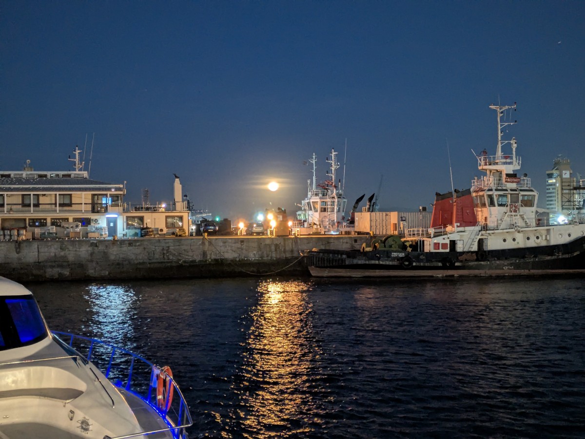 Ein voller Mond geht im Ostern über der False Bay auf.